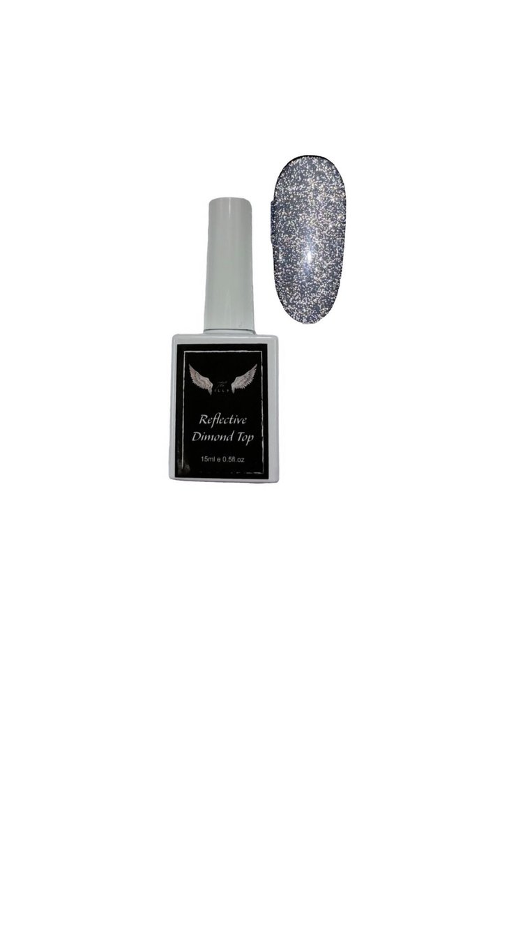 is a reflective, transparent top coat that contains a lot of silvery particles that, in the specific lighting of the room, create a chic shine and iridescence of the top on the nails. This top coat can be applied over both gel polish and camouflage base. The tool has a liquid consistency, prevents the formation of scratches, chips, abrasions on the coating. Can be used as a standalone gel polish finish.